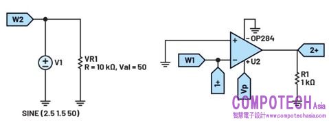 第一個波形產生器用於生成載波訊號,向電路提供4 V峰對峰值幅度、2.5 V偏移、1 kHz三角波激發。第二個波形產生器用於產生3 V峰對峰值幅度、2.5 V偏移、50 Hz正弦波的調變訊號。