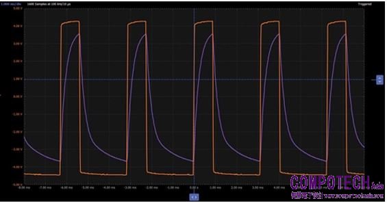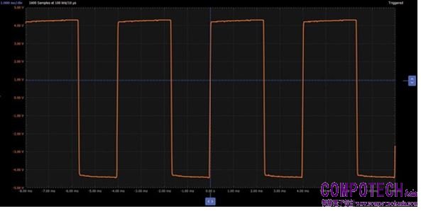 請注意,輸出訊號的工作週期約為50%,而低/高電壓值往往達到正/負電源電壓值。