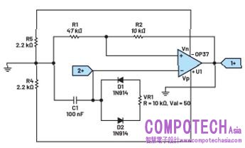 圖10所示的電阻R3被電位計取代,並插入兩個二極體。現在電容的充電電流通過D1,而放電電流通過D2。根據電位計VR1的調整情況,通過上部分支電路的充電電流電阻與通過下部分支電路的放電電流電阻不同。