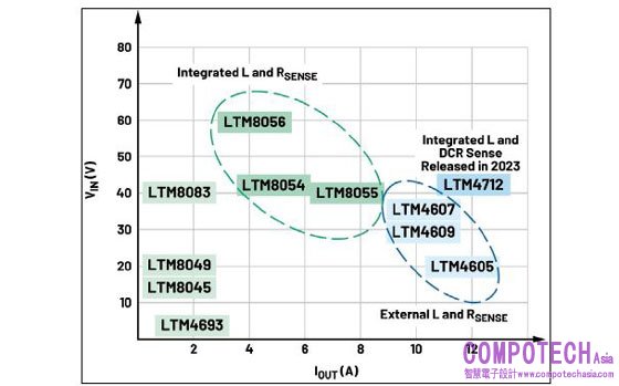 ADI μModule 部門開發了多款降壓- 升壓穩壓器。如圖1 所示,LTM8045、LTM8049、LTM8083 和LTM4693 目的在滿足較低電流應用的需求。而LTM4607 系列、LTM8055系列以及新發表的LTM4712 降壓- 升壓模組支援大電流應用( 最高12 A)。LTM4607/LTM4605/LTM4609 系列內部整合了控制器和MOSFET,但需要在PCB 上連接外部功率電感和感測電阻(RSENSE),以構成完整的電源解決方案,如圖2 所示。