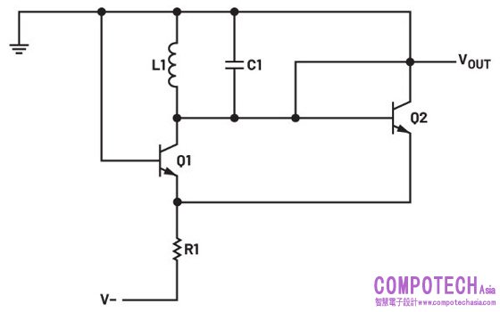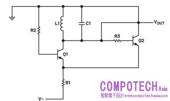 在此振盪器配置中,LC諧振電路的峰對峰值擺幅很有限。當Q2的基極電壓正向擺動至高於地電位時,Q2的集電極(集電極基極結)將正向偏置。這會將最大正擺幅限制在大約一個二極體正向壓降的範圍內。峰值負擺幅也是此種情況,此時Q1的集電極負向擺動夠大,以使Q1的集電極基極結正向偏置。當BJT電晶體的集電極基極結正向偏置時,基極電流急劇增大。我們可以利用該增大的基極電流來提高LC諧振電路的峰對峰值擺幅。如果在Q1和Q2的基極插入串聯電阻,如圖2所示,在LC諧振回路電壓達到極限時,流經電阻的新增電流會降低Q1和Q2的基極電壓。
