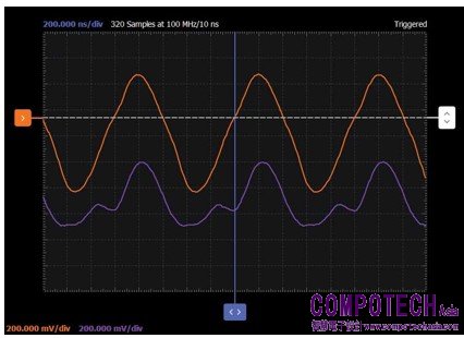 將兩個示波器輸入均設定為200 mV/div,並將時間基準設定為1 µs/div。將觸發訊號設定為通道1的升緣。參見圖4所示的試驗板電路。