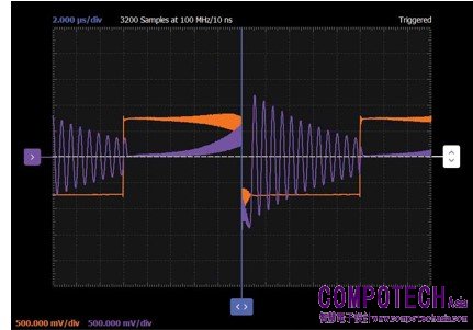 打開+5 V電源,並啟動AWG。觀察輸出波形。其應該由若干週期的正弦波脈衝組成,從AWG 1方波的降緣開始,到升緣結束。參見圖4。
