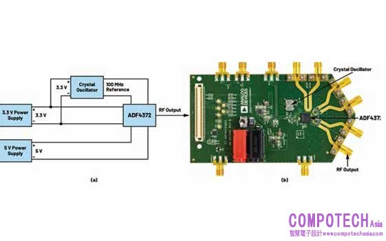 圖1:(a) ADF4372 的具體電源結構;(b) ADF4372的展示板。