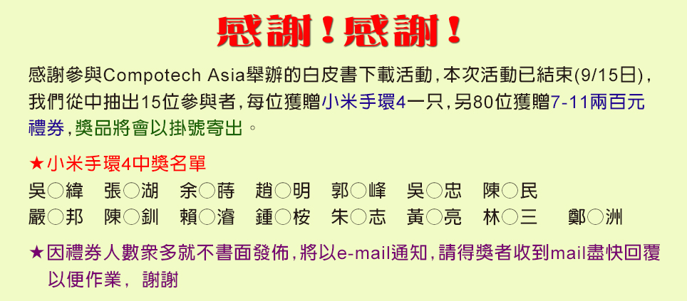 獲獎者將收到手機或email通知,並於2019年9月16日在 COMPOTECH Asia 網站公佈