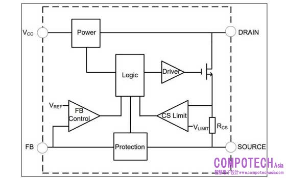 圖 :AL17x50 的功能方塊圖,整合 MOSFET 以減少 BOM 並提高低負載時的效率