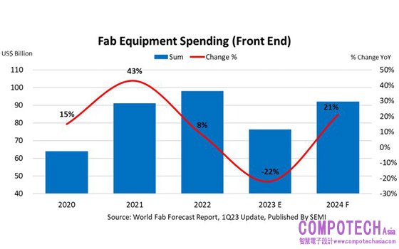 2023年3月22日--SEMI國際半導體產業協會今(22)日公布最新一季全球晶圓廠預測報告(World Fab Forecast, WFF),受晶片需求疲軟以及消費者和行動裝置庫存增加影響,下修2023年全球前端晶圓廠設備支出總額,預計將從2022年創紀錄的980億美元下滑22%至760 億美元;2024年則回彈 21%至920億美元,重回900億大關。